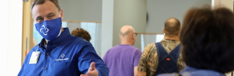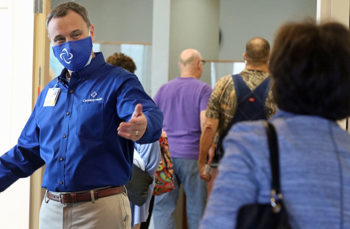 Chris Peek, President and CEO of CaroMont Health welcomes educators as they arrive for their first COVID-19 vaccinations. Photo courtesy of the Gaston Gazette.