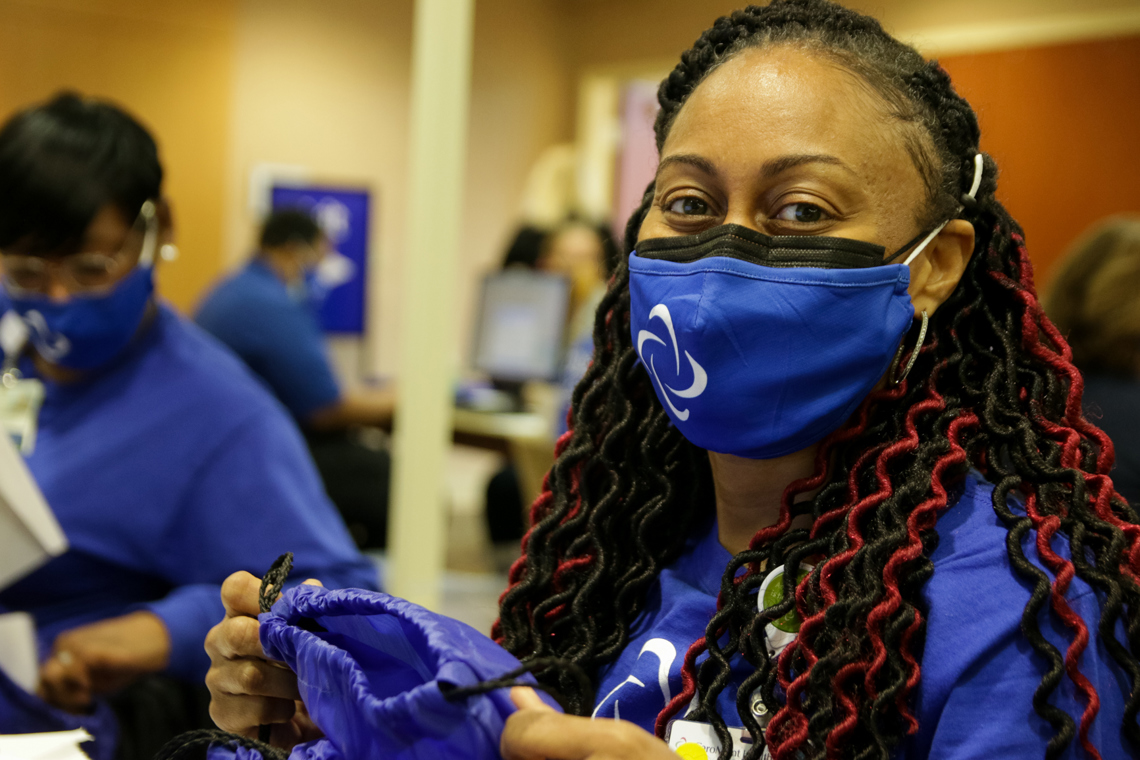 Jemeka Burris, IT Professional and COVID-19 Vaccine Team Member, assembles giveaway bags between registering patients. The Vaccine Team represents a broad range of healthcare professionals who have stepped outside of their usual responsibilities to create a robust vaccination program at CaroMont Health.
